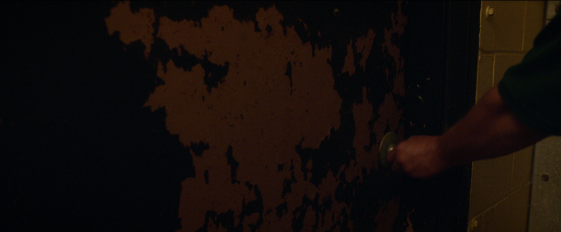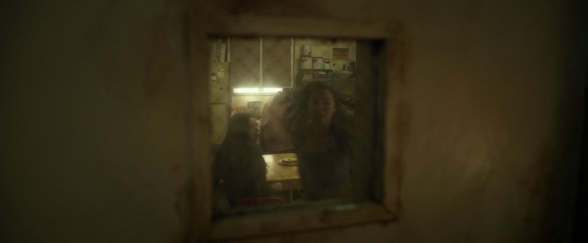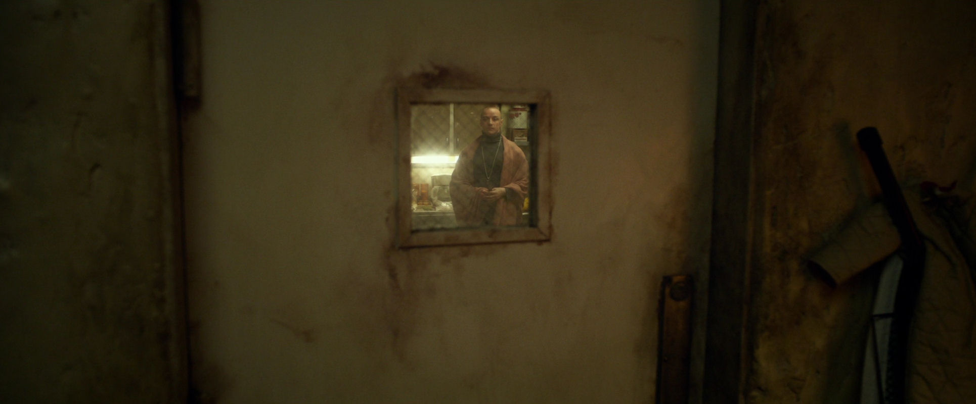 That “half-look” of her face returns in the aftermath of the prisoners’ first encounter with Hedwig, when Casey storms towards the camera to peek through the crack between the door and the frame: