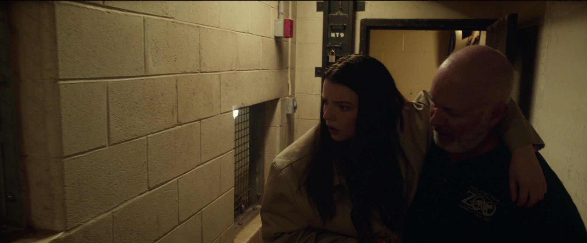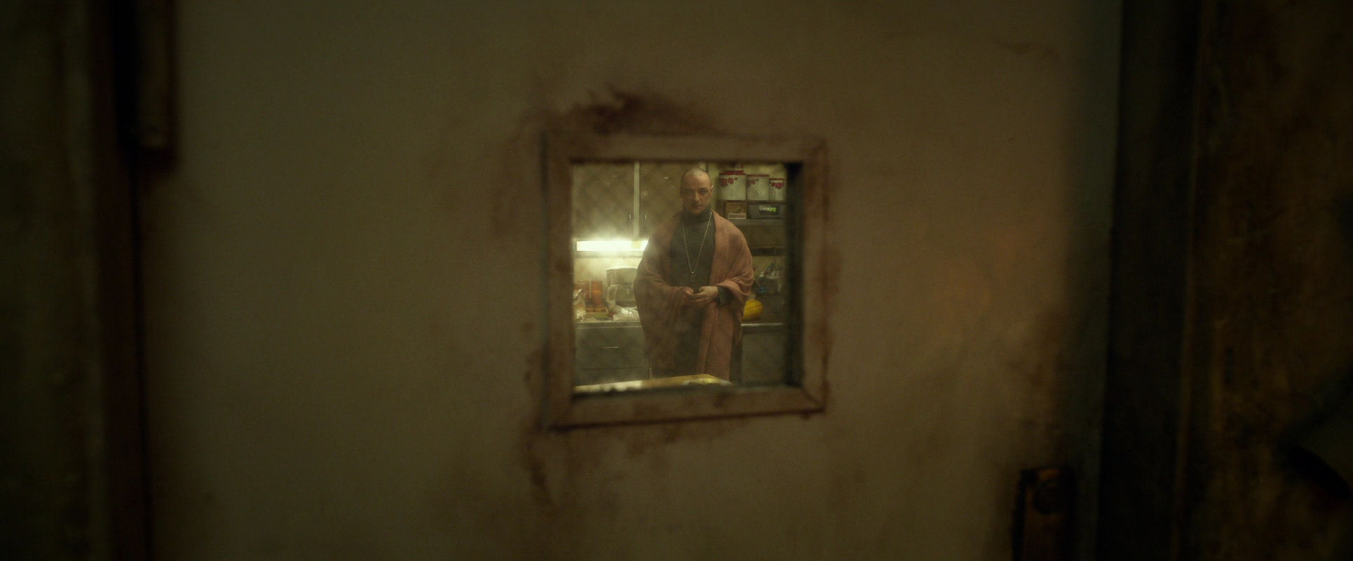 There might also be a small motif around the number three. Split features three prisoners, three psychiatric sessions, three murdered characters, three member of The Horde (Dennis, Patricia, Hedwig), three layers of clothes peeled off Casey, three strata of enclosed spaces (cell, anteroom, entire basement), and (as we shall soon see) three corridors.