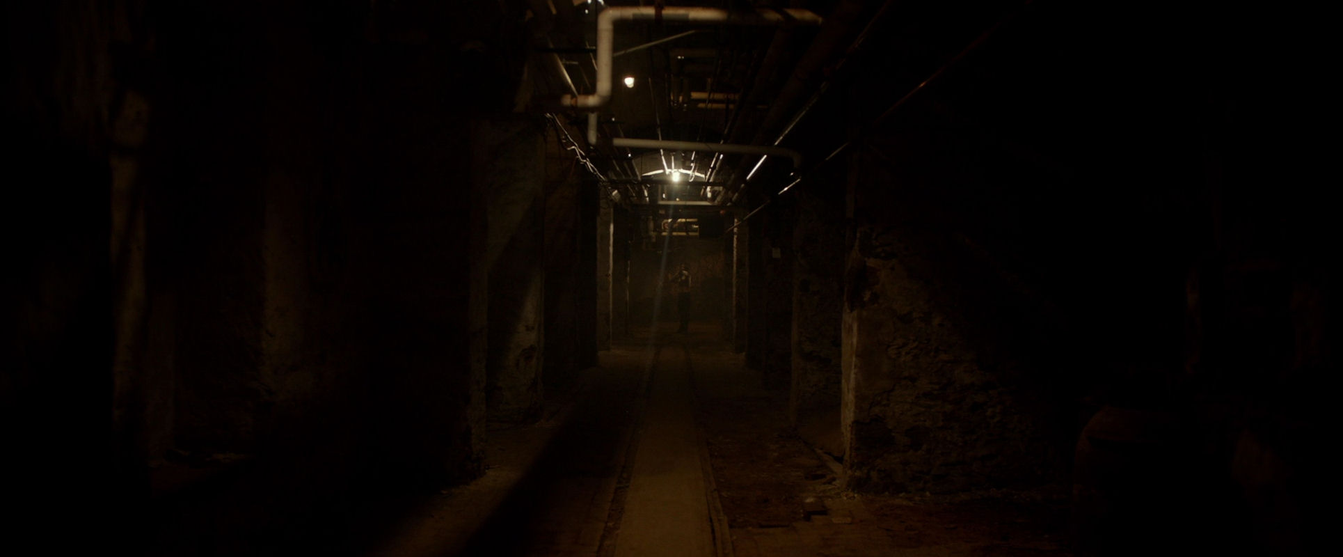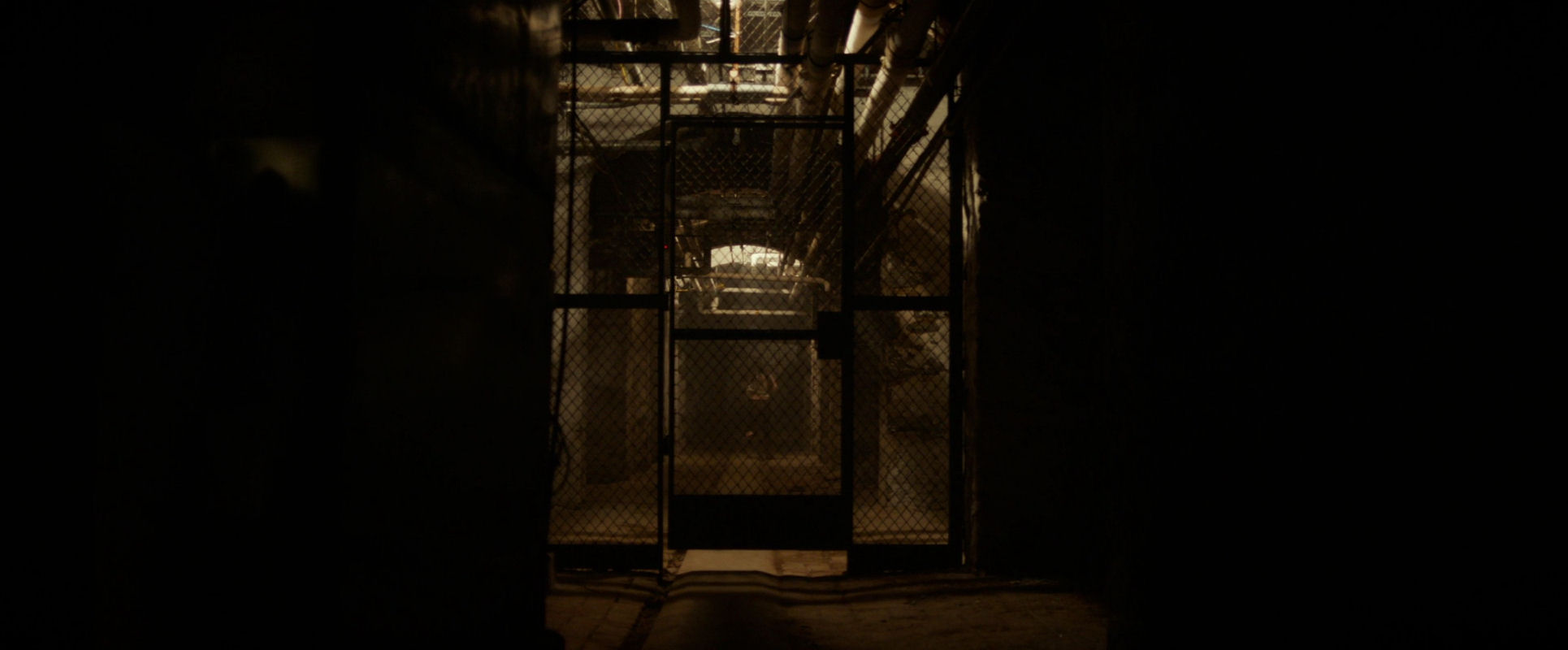 A special feature of the Split landscape is an enormous arsenal of pipes. They can be found in the tunnel and the outer corridor, adding visual complexity and metaphoric associations to co-existing identities and parallel trajectories, but like the corridors themselves they all run in the same direction along similar lines of perspective. The top shot below depicts the outer corridor – with Dr. Fletcher and Dennis on the way to their impromptu session – keeping up the strategy of cavernous long shots. It is an image of utter simplicity, but the pipes provide dissonance, a restrained wildness and surrealism: