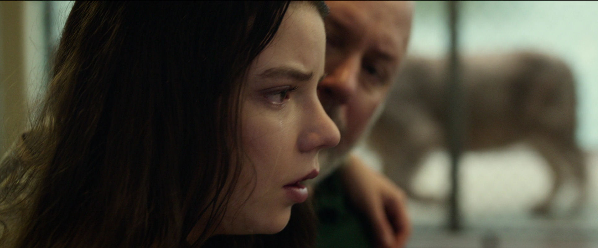 The deer scene contains one of Split‘s few instances of non-diegetic music from an external source, the mournful “Tribunale” by Ennio Morricone, originally composed for The Murri Affair (Mauro Bolognini, 1974). Within a paradoxical framework of a beautiful autumnal landscape it drives home a bleak world view of predators and death. Her father says: “The thrill, Casey, is about whether you can or can’t outsmart this animal.” The scene illuminates Casey’s two conflicting tendencies: using her intelligence to outwit The Horde, or just give in to a feeling of inevitable doom, made emblematic by the fallen animal. (It is telling that Marcia’s “we can win” is immediately parried, as if an automatic response, by Casey’s “he’ll hurt us”.)