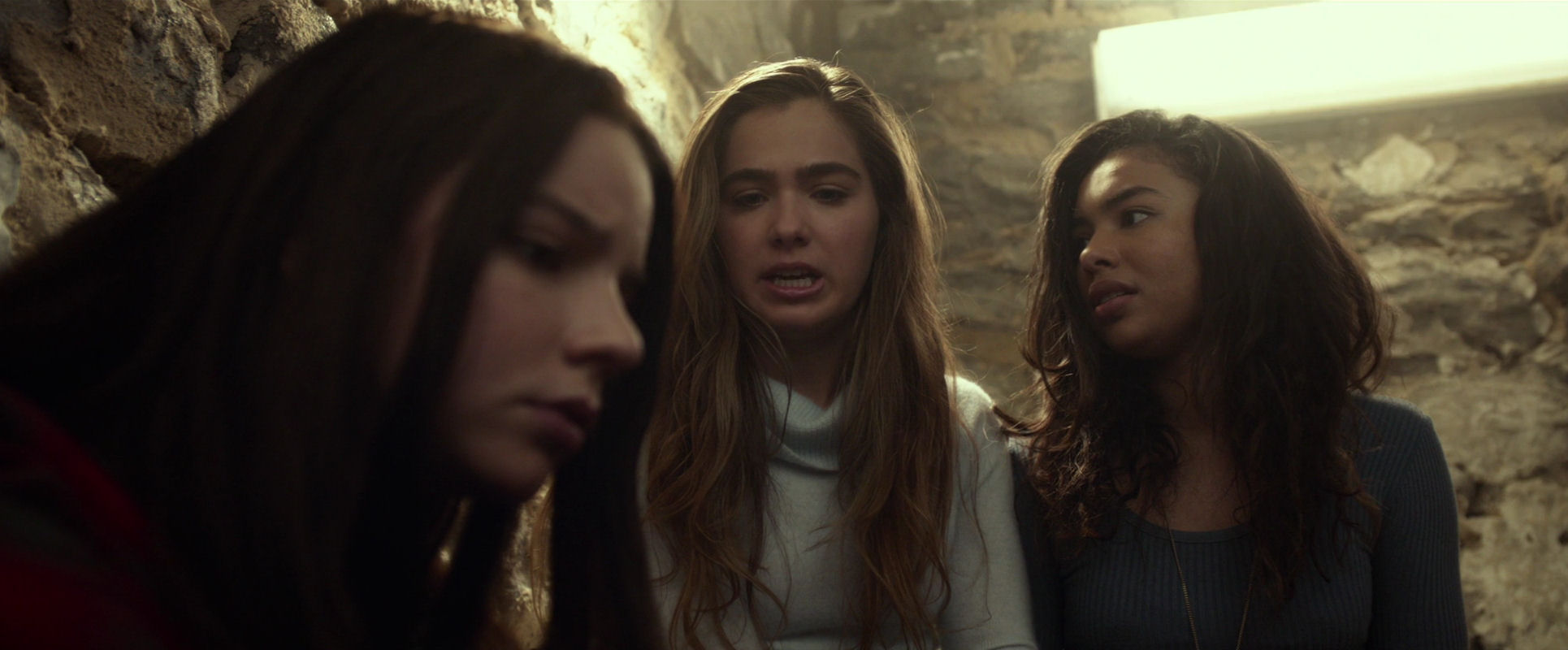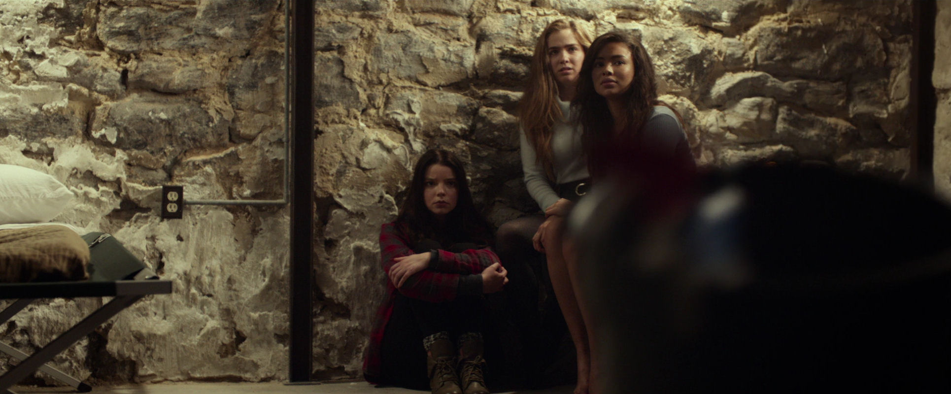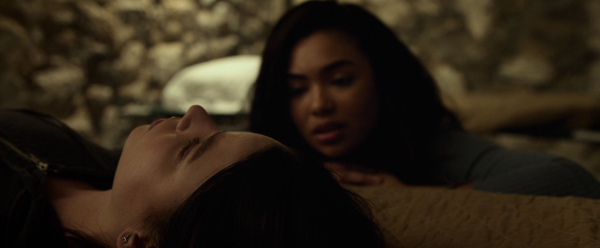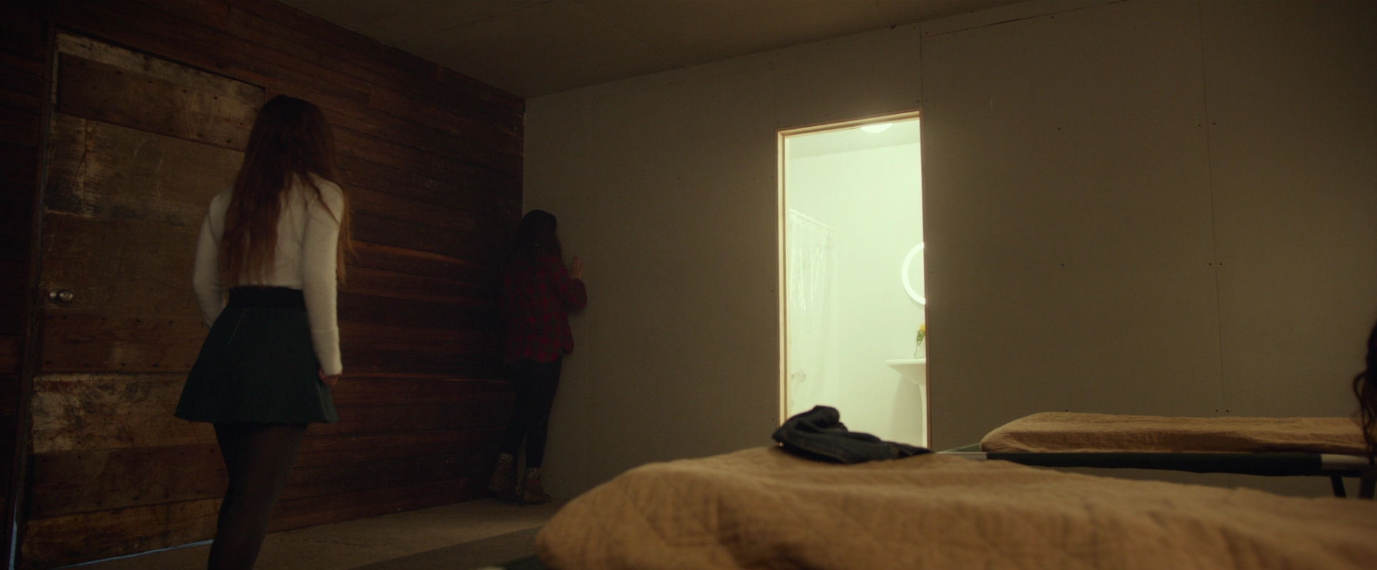 In the above shot the focus also signals Casey turning introspective, leading to the second flashback. It comes in response to Claire’s exasperated line: “Why do you act like you’re not one of us?” It is not an act, however, a core issue that Split sets out to gradually and convincingly demonstrate. After the astounding climactic unveiling in the cage, where the documentation of Casey’s apartness is carved into her scarred body for The Beast to see, his exclamation “You are different from the rest” echoes Claire’s question. The fact that Casey wears many more layers of clothes than the other girls also hints at a deeper personality, and her deep red outer layer sets her further apart from the other girls’ neutral colours.