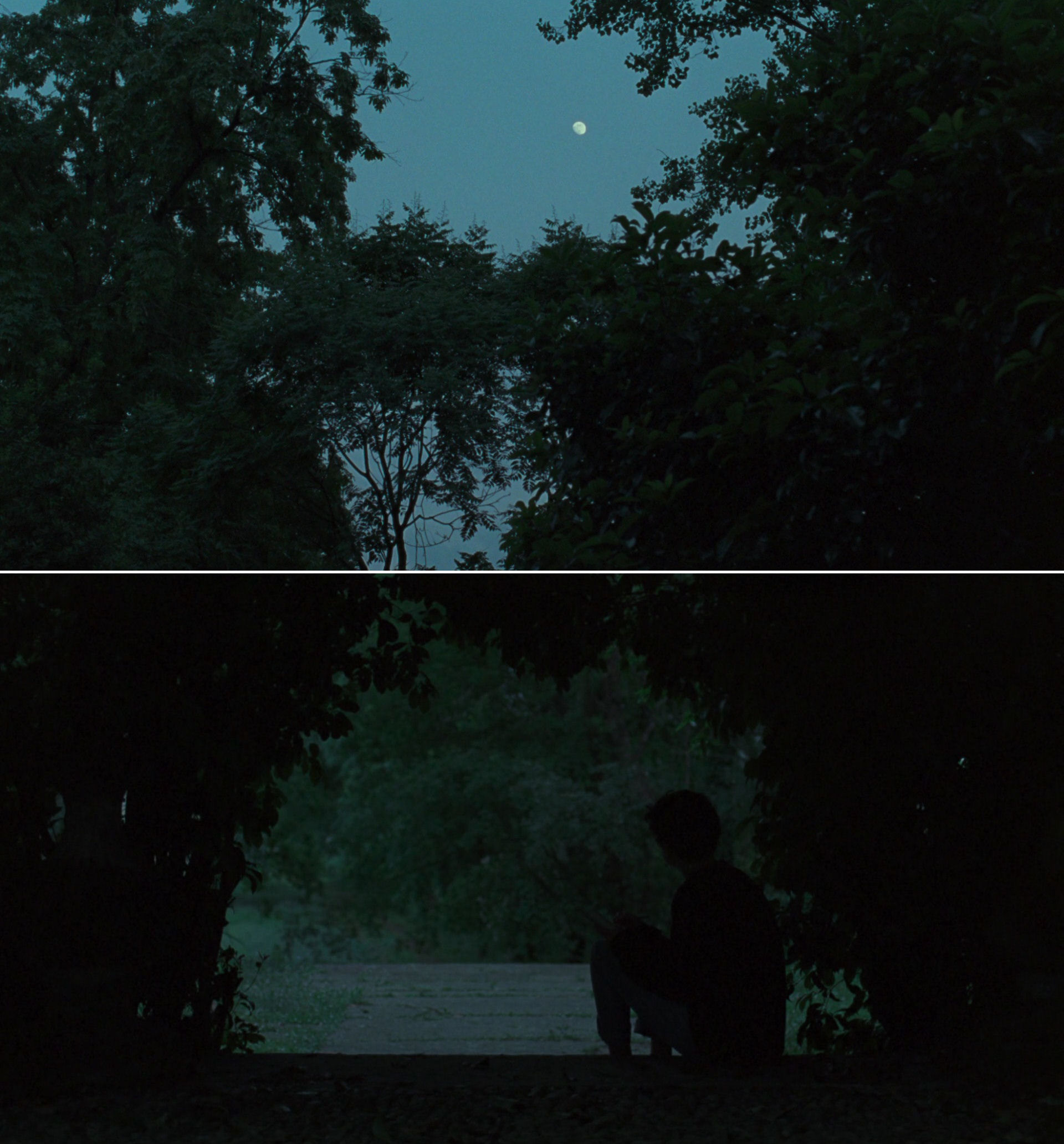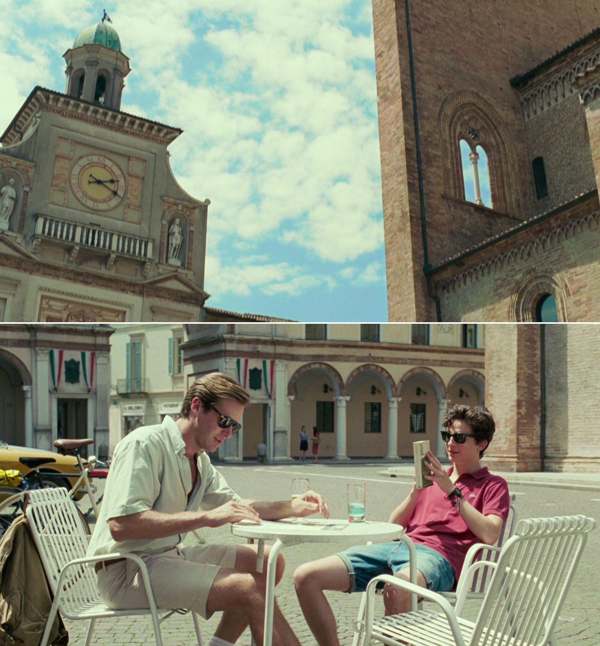 Coincidentally, the film’s first scene where Elio and Oliver have a private conversation occurs in a square too (not the same place though) and that too is shot in a long take (of 80 seconds). All three scenes in the above slide show have to do with time. In the conversation scene the camera takes in a bell tower and the scene ends with bells ringing. Later, as Elio is waiting for Oliver to come home, the shot starts with the moon. The calmness of these situations is cast aside on the third occasion, where the camera is racing down from the sky in a blur, down to the bus for the departing lovers, probably in reflection of the exhilarated mood, strengthened by a brutal motorcycle sound, and there is a bell ringing as the bus is ready for departure. (The bells, as well as the one in the piazza scene, are part of an extensive pattern connected to Oliver.)