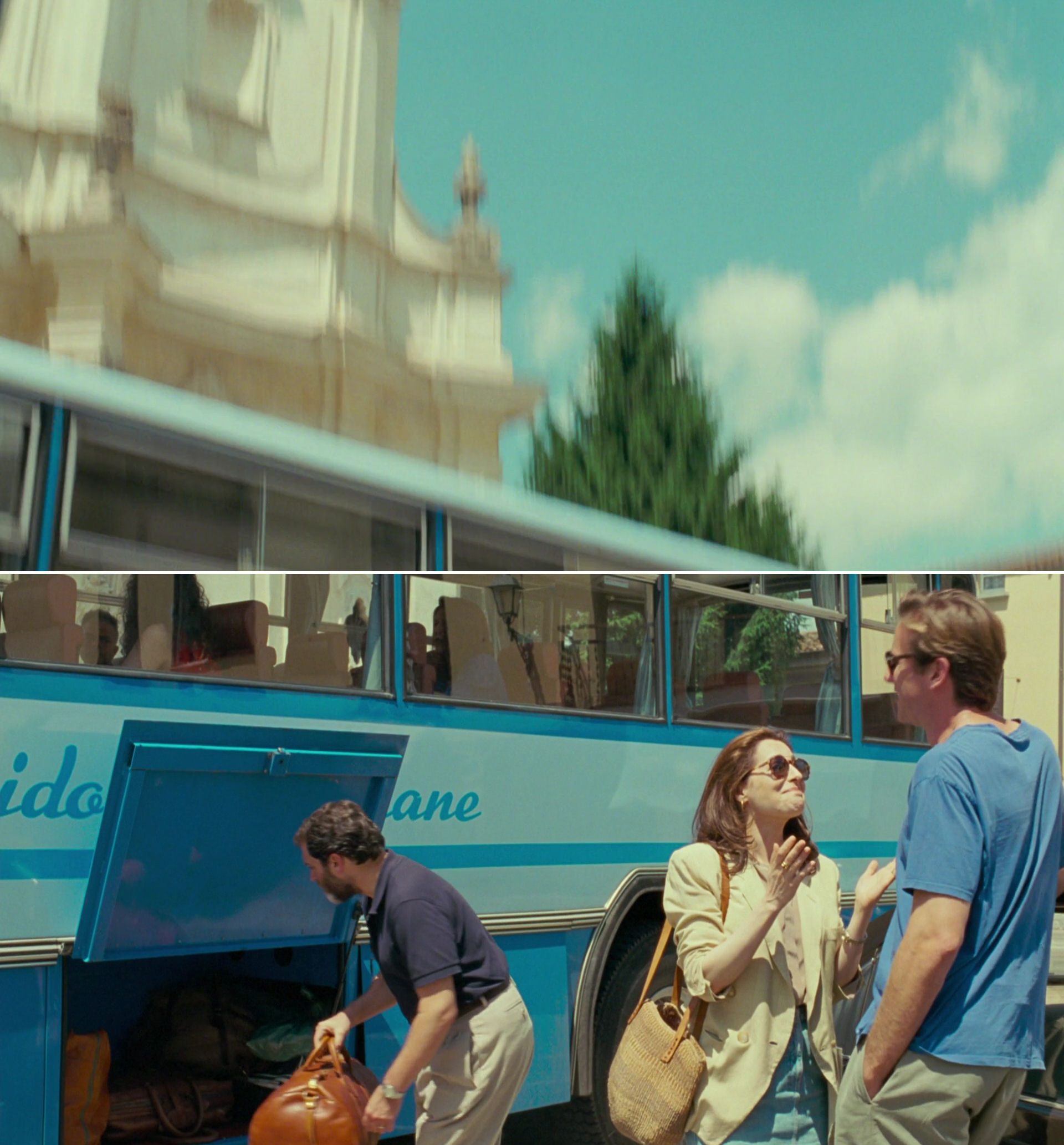 Another flourish: as they meet on the other side of the monument, a bus arrives. Elio looks at it while Oliver is off getting the manuscript, and it remains visible in the background for a considerable time. It is the same bus (the same company at least) that Elio and Oliver will eventually leave in. Thus, the following conversation with the bus in the background takes on a certain irony: (Oliver) “Don’t go anywhere. Stay right here. ” (Elio) “You know I’m not going anywhere.” (Later, an eager Chiara echoes Oliver’s “don’t go anywhere” but he just bikes off.)