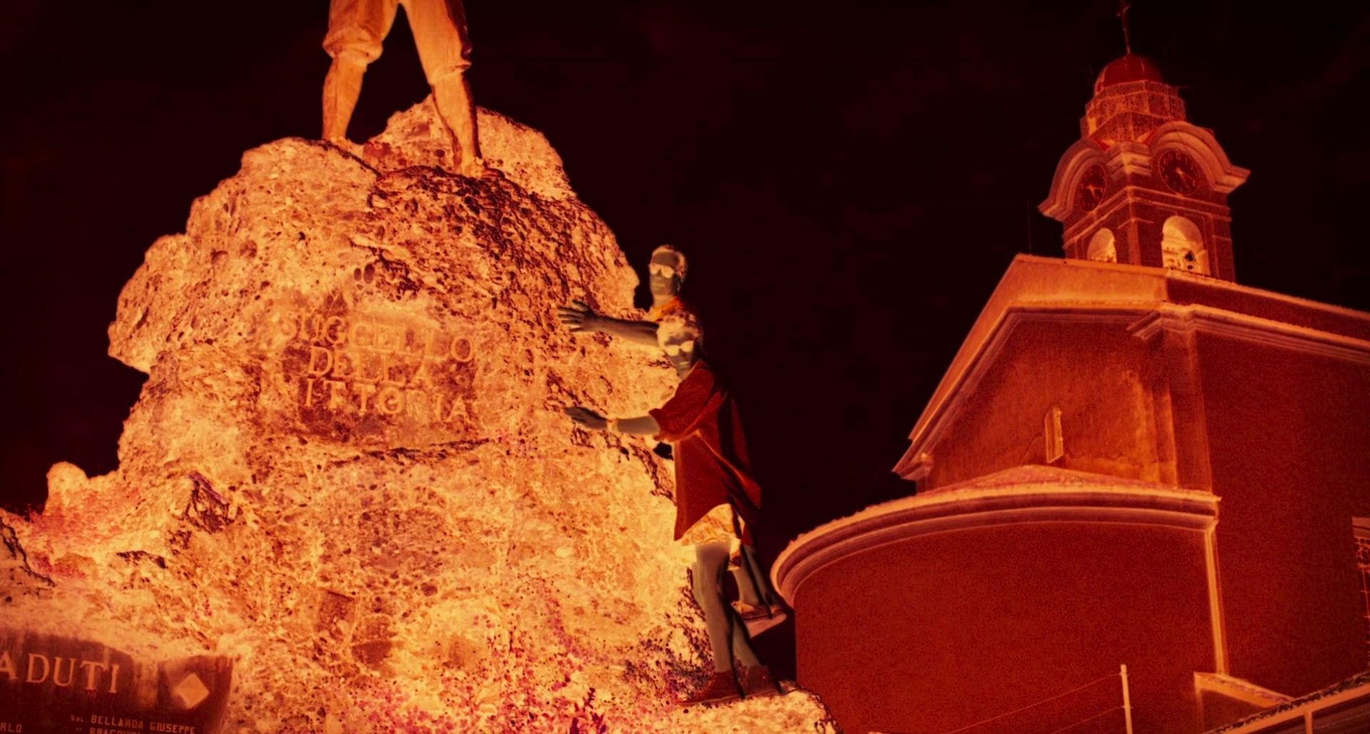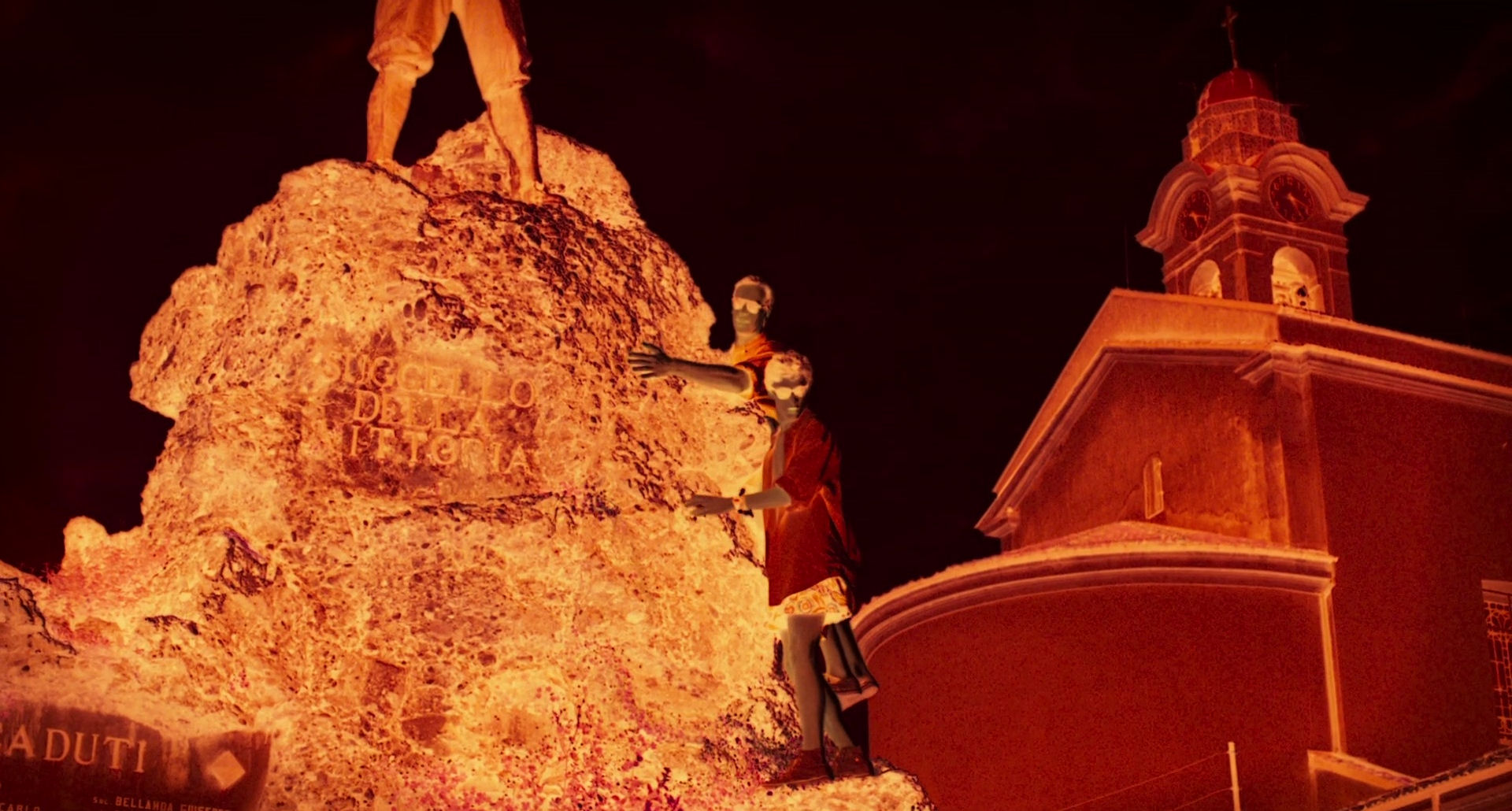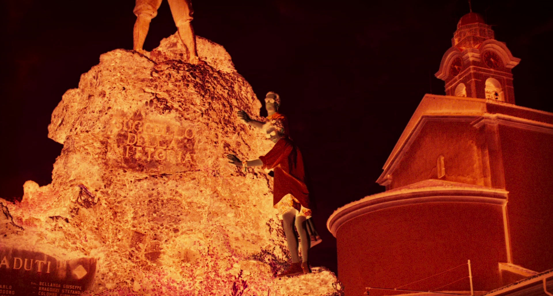 In the dream they have climbed the Battle of Piave monument and especially the first shot is very strange: through some camera trick the monument seems adrift, with the church in the background unmoored from the foreground as the camera moves. This could be a clever representation of the spinning mind of a person gone to sleep while still drunk. Contrary to the real scene, Elio is wearing a shirt here. This could be Oliver’s shirt, which he was gifted.