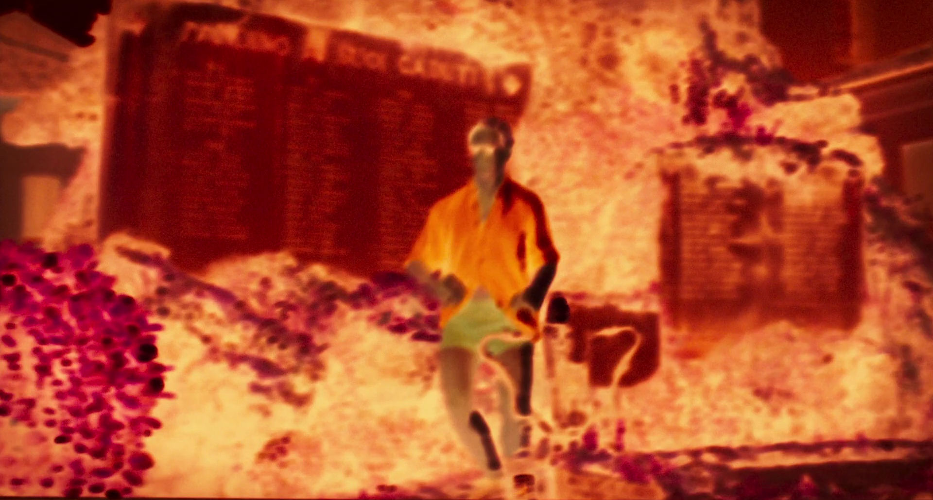 Backtracking a little: As Elio twice more, with certainty, repeats the line “Because I wanted you to know” against the Ravel piece, the intimacy of his words melts into the music in a lyrical, emotionally uplifting symbiosis. This verbal and musical poetry is soon joined by visual and historical poetry, as the camera boldly tilts upwards along the monument, falling to rest on the soldier. He stands naked and honest against the sky, fearlessly engaging with the world, the spiritual condition Elio is working towards.