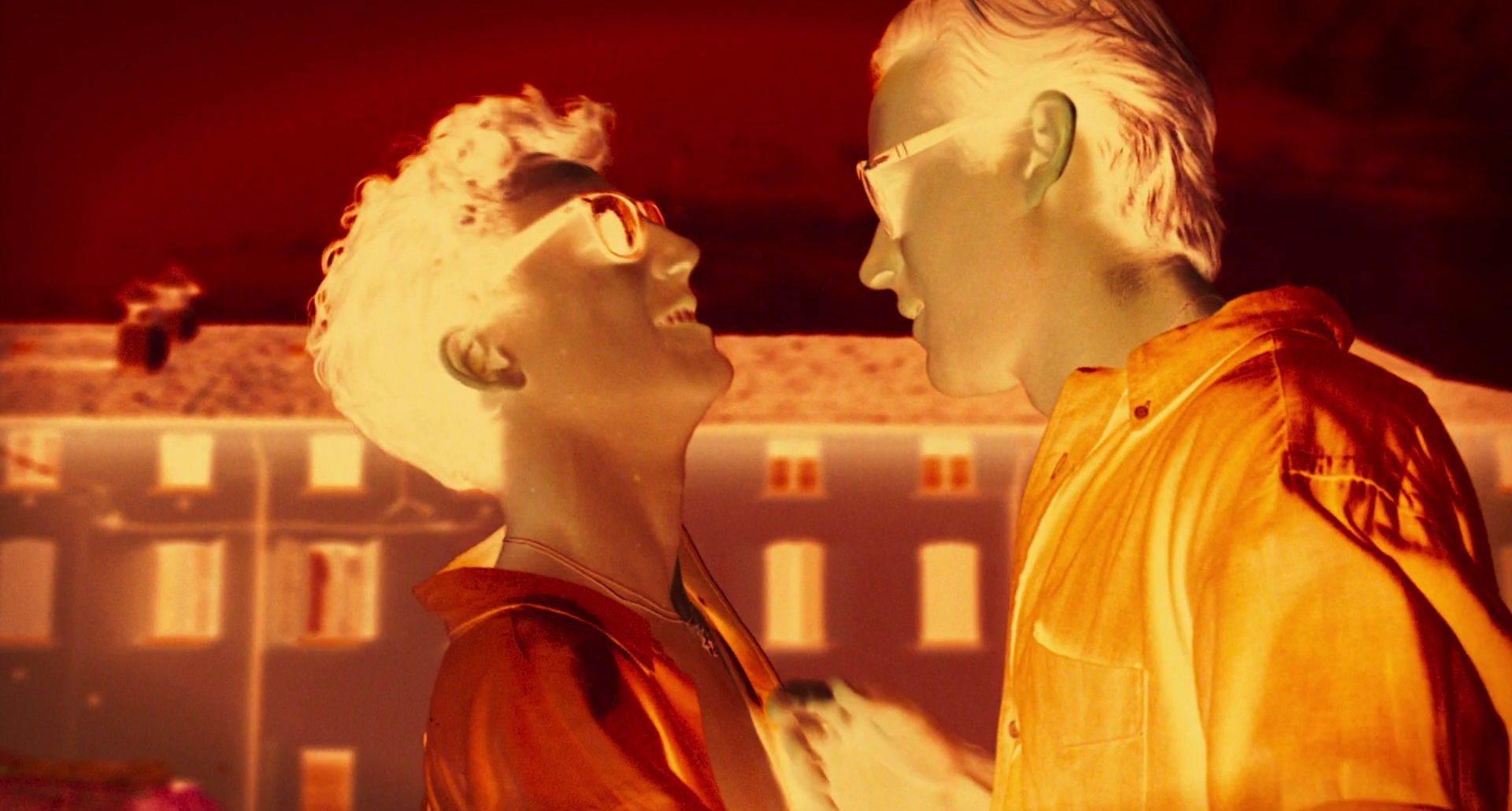 Let us follow the film a bit further after the piazza scene, where the music returns and its name, “Une Barque sur l’océan”, really comes into its right, as the characters are floating through an ocean of nature. The shot starts with a close-up of Oliver panting and sweating, as if the bike ride is a substitute for sexual activity, as they engage in their usual competitive games. This can be seen even after they have become lovers, for example in their playful wrestling during the midnight tryst and in the hotel room late in the film. (The scene before that, when they run shouting their names up the hillside towards the waterfall, is not just them being drunk with love, but likely also a competition to reach the goal first.)