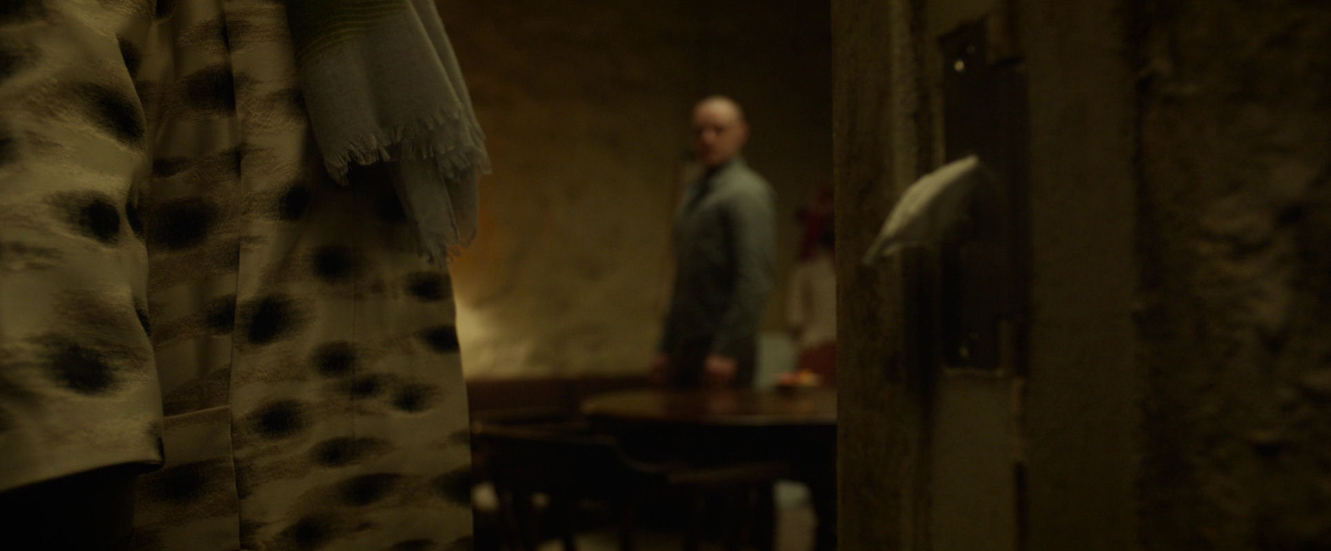 Two shots echoing each other – consequently filmed with rhyming lateral camera movements from roughly the same position, just in opposite directions – both involving Patricia, the anteroom and escape attempts. Marcia will try to escape from the kitchen; Casey has tried the same from Hedwig’s room. The left shot is our first look at the anteroom other than through the door crack, and Patricia represents an expansion of the prisoners’ universe, introducing them to the corridor, kitchen and (for Marcia) the living room.