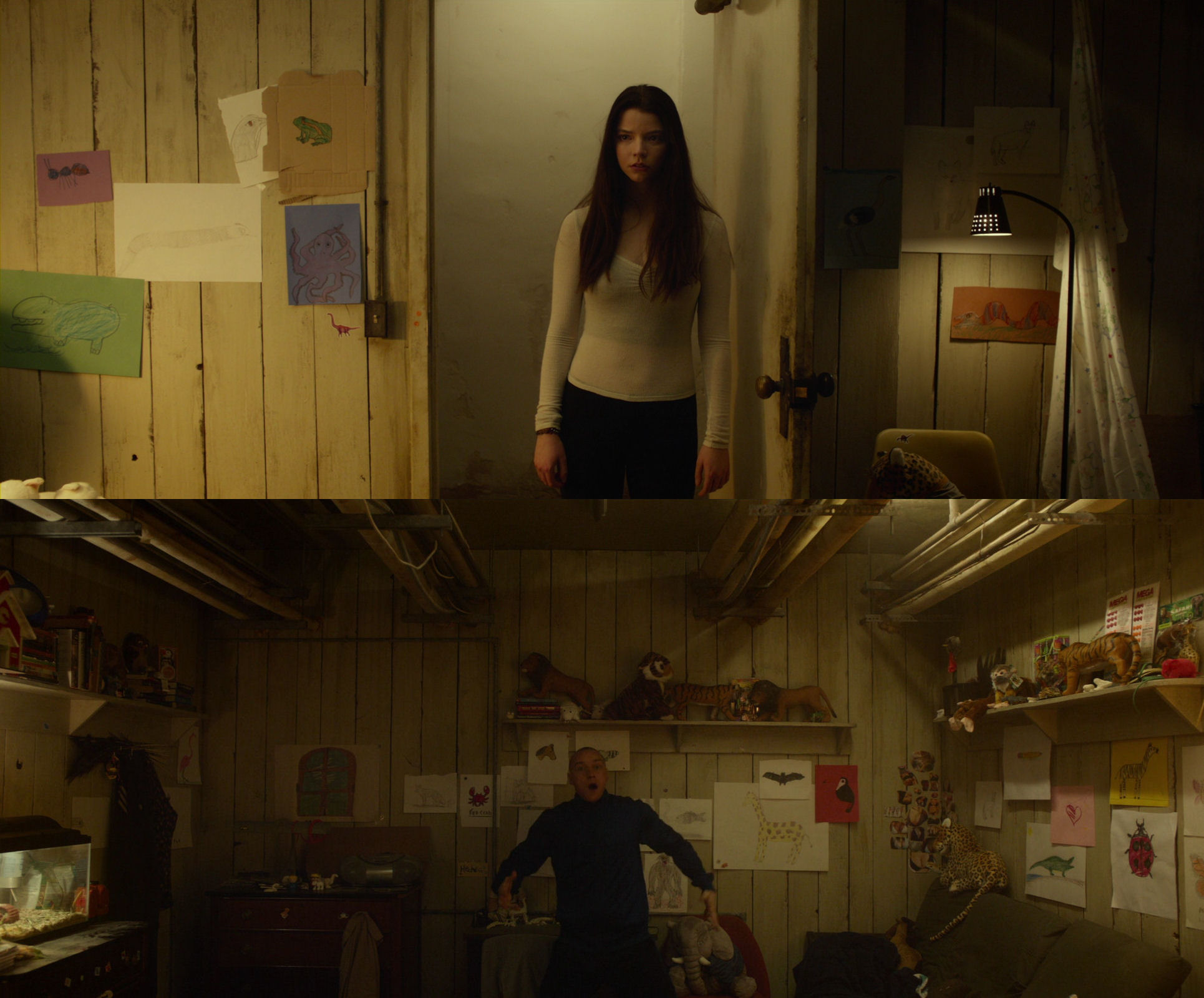 There are 15 shots in Split of a duration of 30 seconds or more – see general shot statistics here and a list of long takes here – with the longest one being the first stretch of the zoom-in on Dennis in his basement conversation with Dr. Fletcher, lasting 126 seconds. This is few, however, compared to the 61 thirty-second-or-more takes of its companion film Unbreakable, where the longest one covers 229 seconds (the train seduction scene). The average shot length of Split is a paltry 5.96 compared to 18.90 for Unbreakable. And there are as many as 21 shots in the earlier film longer than the second-longest in Split (The Horde’s internal discussion in the mirror during the epilogue). In this regard Split belongs firmly in the same bracket as the formally less adventurous works of Shyamalan’s middle period: The Happening (7.16), The Last Airbender (6.80) and After Earth (4.99).