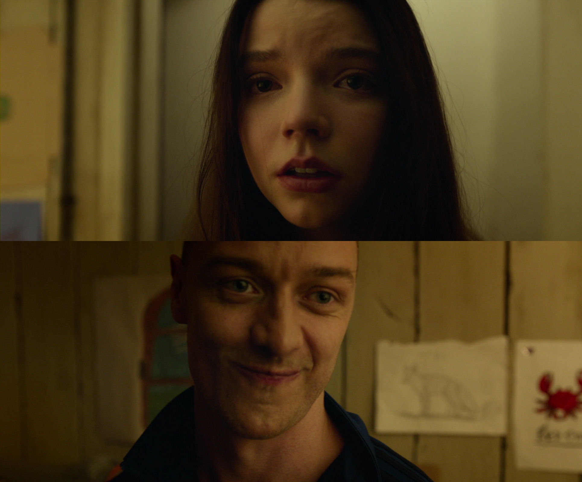 The most intimate dialogue constellations between Casey and the various identities are with Hedwig. But here too, like between her and the other girls, there is a careful disconnect. In their first scene, they are only intermittently sharing the shots (left column), for example when she whispers the lie that The Beast is coming for him, or in order to include the other girls in the frame. The rest of their extensive interaction is very cleanly shot, in separate frames. After all, there is no real intimacy here – she is trying to trick him.