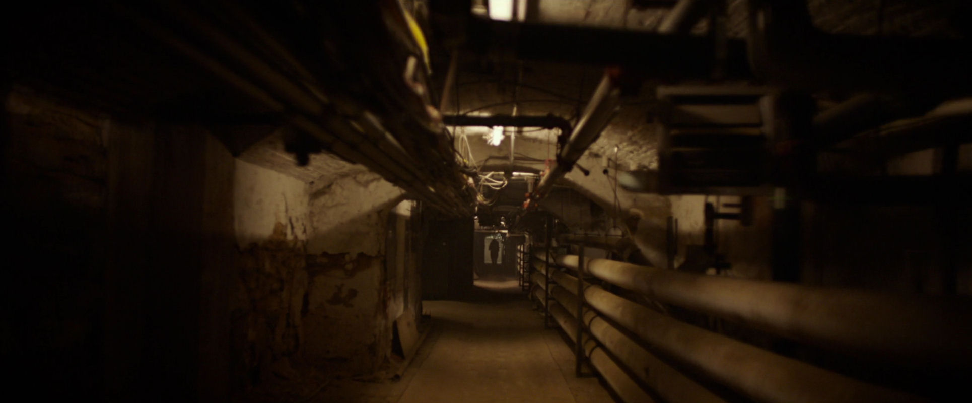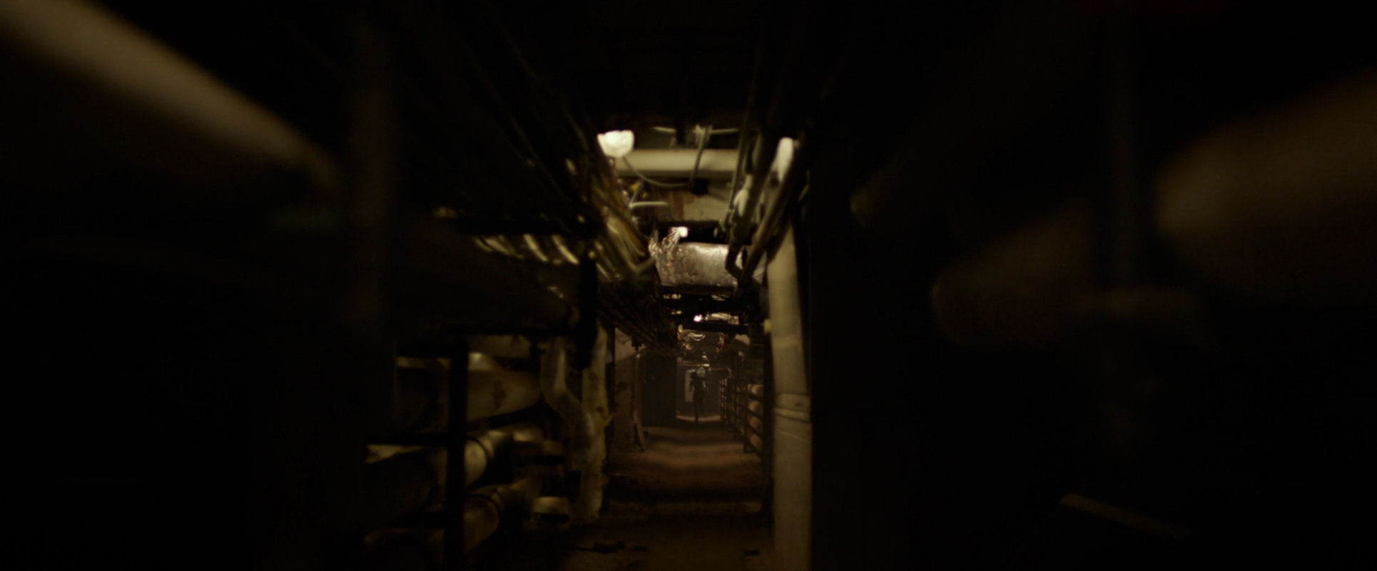 (row by row) A 26-second virtuoso travelling shot keeping in front of Claire as she runs at full throttle – with the pipes like a surreal halo – before the camera pans to capture her hiding in the wardrobe closet. This is a milder sister shot of nightmare and panic of Casey’s own flight through the same tunnel.