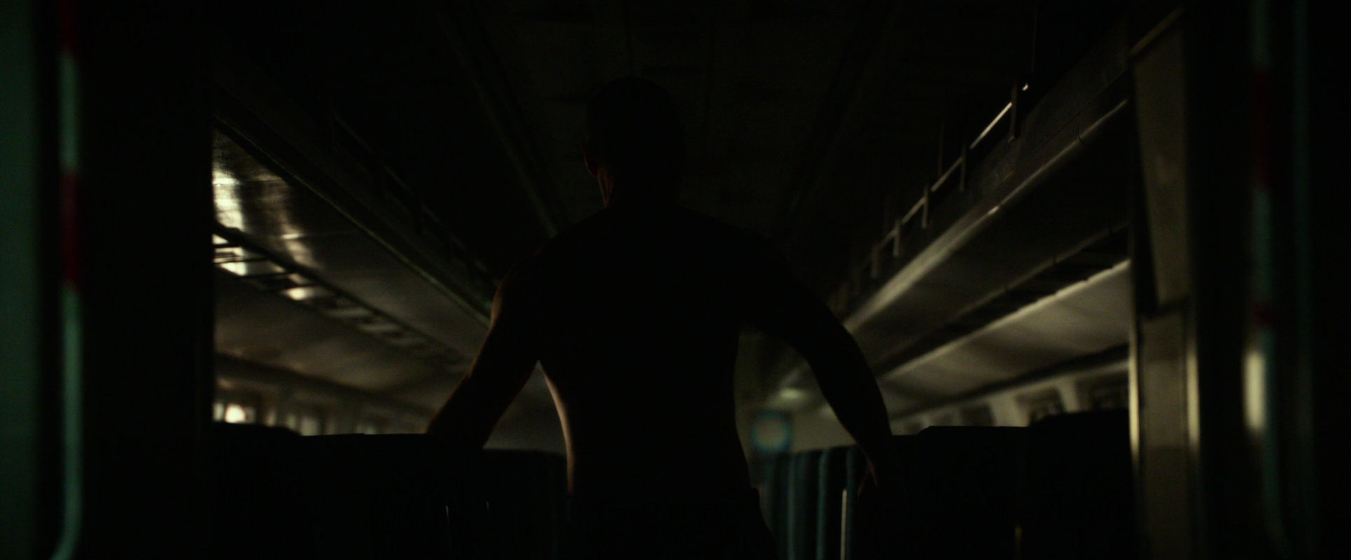 Slide show of another corridor-related moving shot: after Dennis’s transformation inside the train, The Beast leaps up on the roof. As he starts running along it, the camera is following him inside the car, captures him as he jumps down and remains gazing after him while he is running down the track. (Look here for a montage of stills for the same scene.)