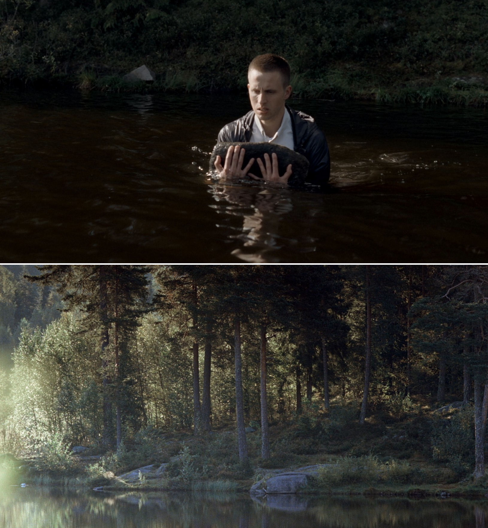 In both films a character is shown in long shot enclosed by a visually distinctive framing. The top image shows Jonah in the prologue of Louder Than Bombs hunting for food for his wife, who just before has given birth to their child. In Thelma, Anja walks in the corridor leading to her apartment.