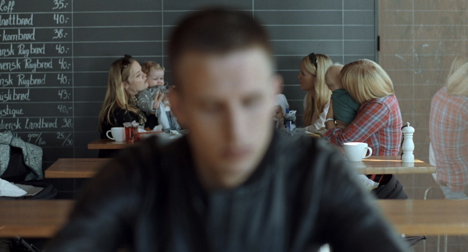 In addition to the montage sequences, non-linear editing is another Trier trademark, for example in the scene with Kari and Phillip above, alternating between a café and a park, often with the sound of one place switched with the other. Something similar briefly happens also in Oslo, August 31st when Anders bids goodbye to his best friend in the street, and there are also flash-forwards in the scene at the Frogner Bath. (And as for misplaced sound, we still hear the sounds from the café while the hero is visualising the imagined lives of two passers-by.) In Louder Than Bombs there is a continuous pendulum between the teachers party and the love scene afterwards. In Thelma this editing approach only occurs in a short burst during the epilogue, and on top of that it is highly ambiguous what is really unfolding: something merely in Thelma’s mind or a true jump in time?