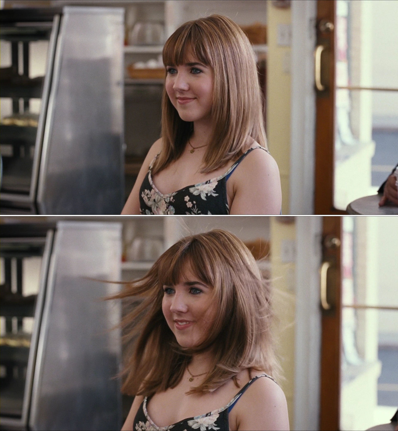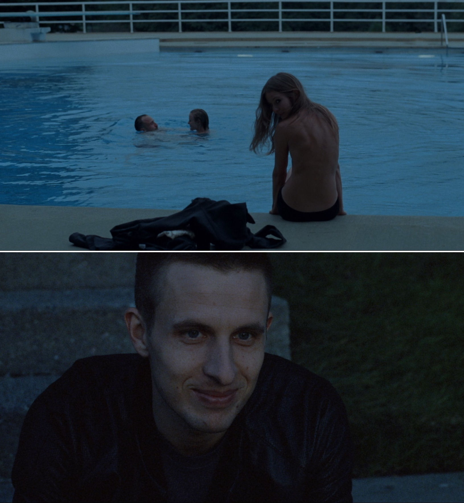 In Reprise there is a direct cut from Kari, the owner of that hair, whom we here (top) see for the first time in the film, introduced from an unusual angle, but often employed by Trier. In addition to hair, he is fond of the neck and throat, like in a later scene with Kari (bottom).