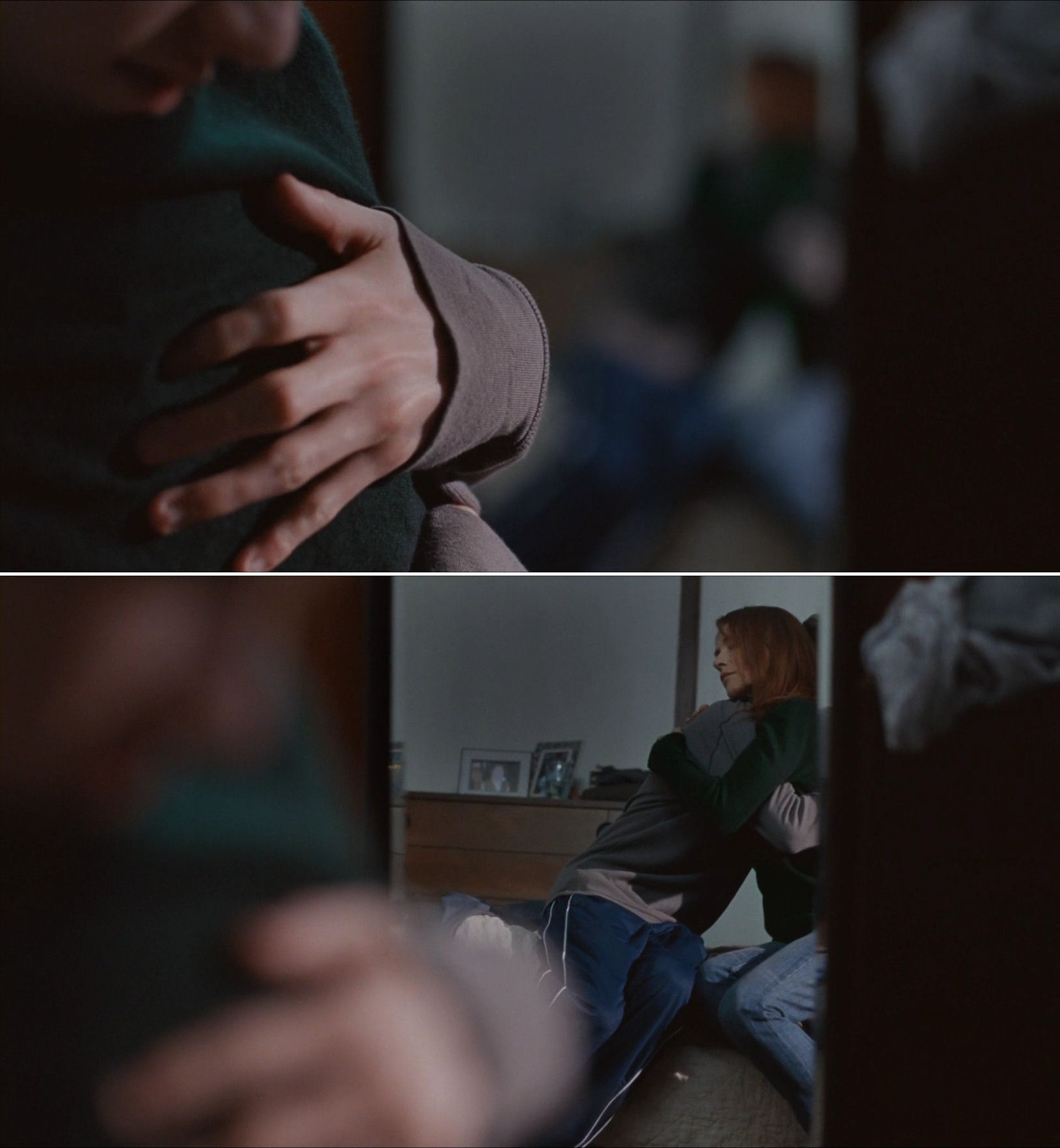 By the way, here is another Trier speciality: the racking of focus within limited spaces, here from face to hand. Inserted: Thelma repeats the same gesture.