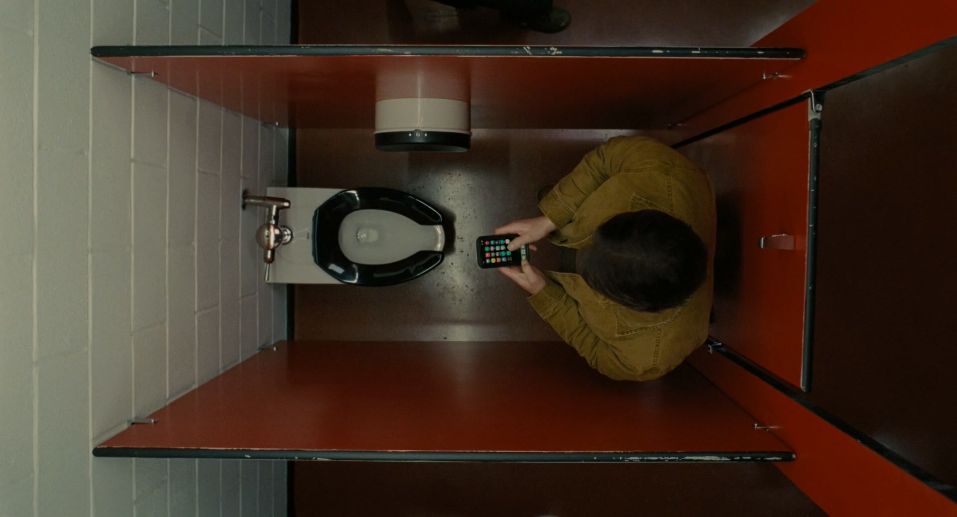 This dissonance shall soon reach another, red-hot level: the girls are filming the concert on their phones, but the next time we see Cooper producing his own, this is inside a stall in a restroom in an overpowering red colour, and he looks down on it with a suddenly seedy, inscrutable face from a menacing vantage point, towering over a low-angle camera. We hear moaning from the phone – is this doting father, this patiently paternal figure, really some sort of sex addict who just cannot resist leaving his 12-year-old to look at grubby porn in the toilet?